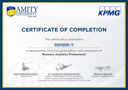 The Amity Online Certificate in Business Analytics Professional is a short course of 50 hours designed to make learners proficient in data analysis, business intelligence, visualization, and predictive modeling.