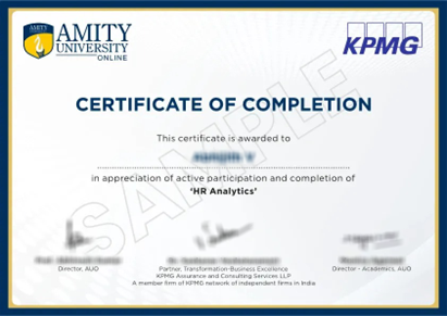 Certificate in HR Analytics is a professional certification program offered by Amity Online University in collaboration with KPMG. This program is delivered through an online mode, including online recorded lectures, online quizzes, and live projects, making this certification program more engaging and interactive.