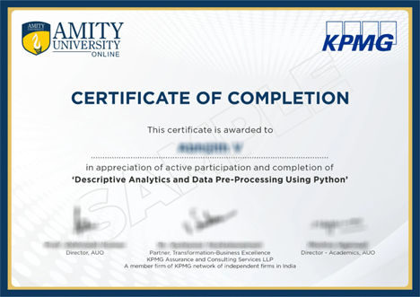 Amity Online's Certificate in Descriptive Analytics and Data Pre-processing using Python is a short duration program of 16 hours. This program is meant for training students in cleaning, analyzing, and data transformation with Python. It equips students and professionals to work with real-world business data and create meaningful insights.